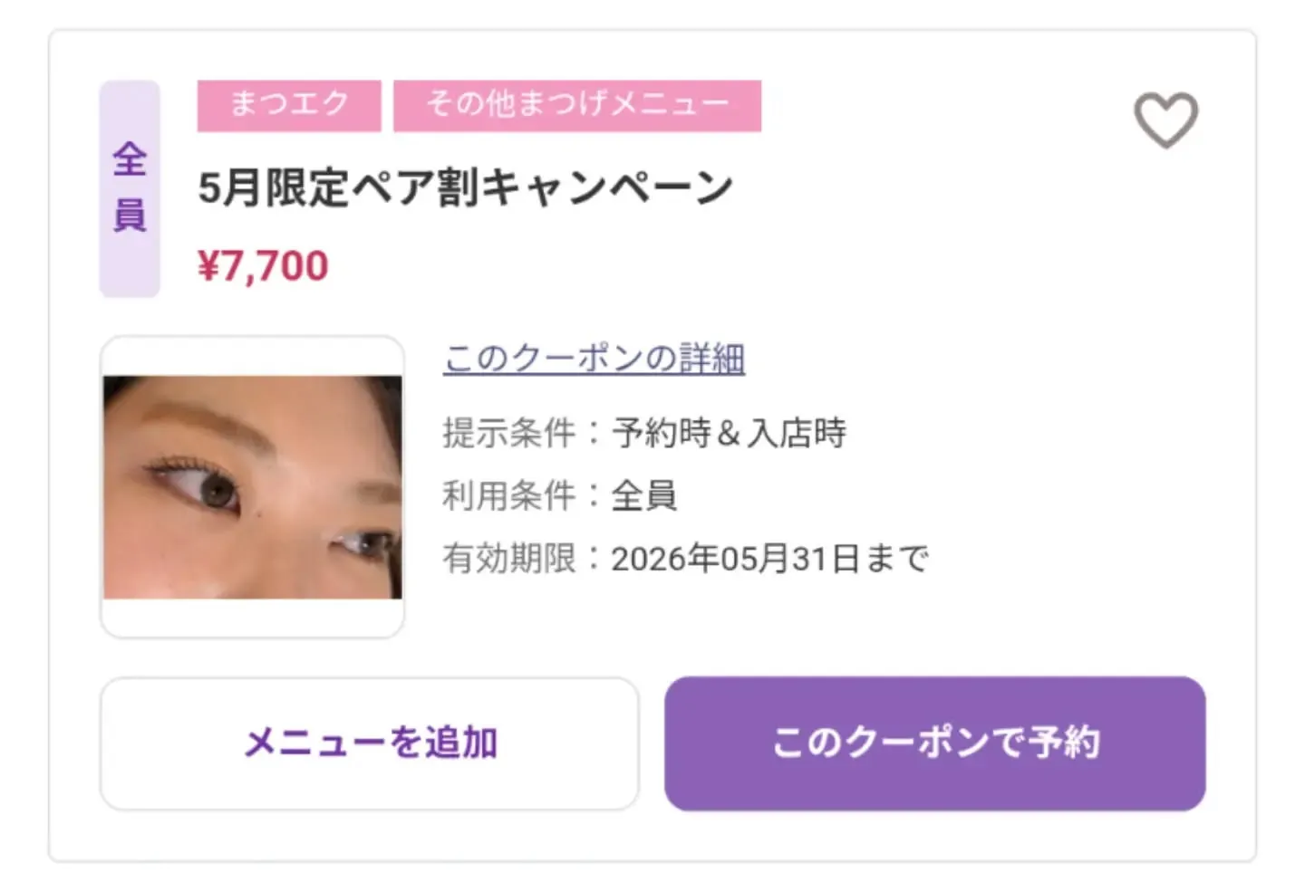 ②メニューは、まつげパーマ・アイブロウリフト・エクステ80本に限ります(¥3,850×2名様で¥7,700となります)